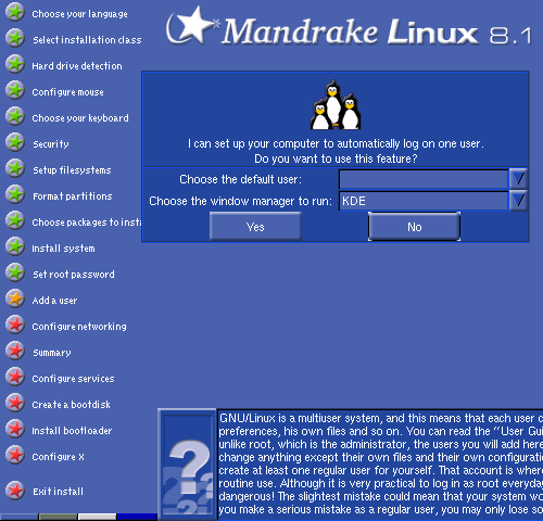 在 Mandrake Linux 8.1 中,可在開機的時候,自動以一個預設的帳號登入(此帳號不可以是 "root")。