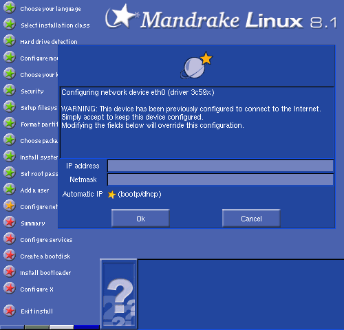 輸入 IP、netmask 資訊,或使用 BOOTP 或 DHCP 。