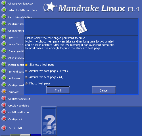 測試列印,請選擇紙張種類,也可以按 "Cancel" (取消) 跳過測試。