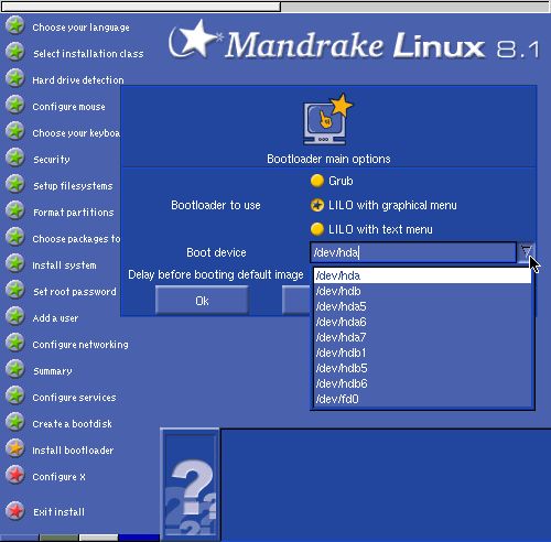 你可以決定要將啟動程式安裝在那裡,預設值是安裝硬碟的 MBS (即如 /dev/hda 為 IDE0 第一顆硬碟的 MBS)。