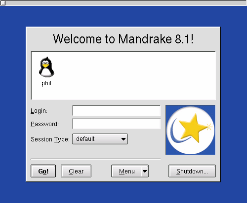 選擇使用者的 icon 或直接打入 ID 及密碼。 然後按下 "Go!" 進入 Mandrake Linux 8.1 。