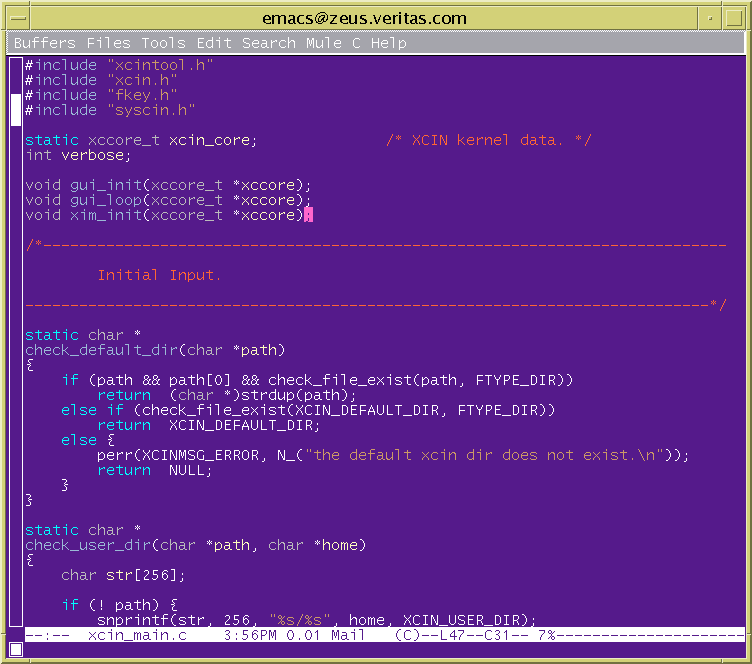 這樣每行一層一層的表現手法有人認為應該統一規定,每次一個層級就是一 個TAB鍵,有人認為不一定,因為標準的TAB其實從螢幕上看起來是空了8格, 如果層級一多就不好看。但也有如Linux的首創者Linus就認為層級多,表示 程式邏輯不夠好,應該避免。不管如何,那是見仁見智的看法,要怎麼定, 看你們團隊的coding style是怎麼定的。emacs內定是按TAB鍵表示是一個 indent層級,但是它不再是真的TAB鍵,所以不會看起來空8格。當你換行後 ,按TAB鍵,emacs會自動把你的游標根據indent規則放過去。像C裡面的 while, if else, switch case,等等他都會自動幫你indent,非常方便。 程式它看起來是這樣的: